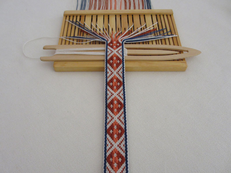 - Structure: Baltic-style pick-up (referred to as Type 2 pick-up in Norwegian Pick-Up Bandweaving; there are 2 background ends between pattern ends in the threading).