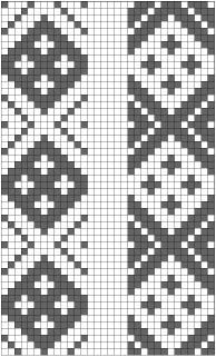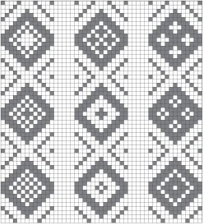 I used a simple hatched diamond (a common motif in Norwegian pick-up bandweaving). I like to weave this pattern with the diamond side up, but I used the reverse side of the band for trimming the bag. My patterns chart is shown below and I’ve included both sides of the band so you can work with whichever side you prefer.