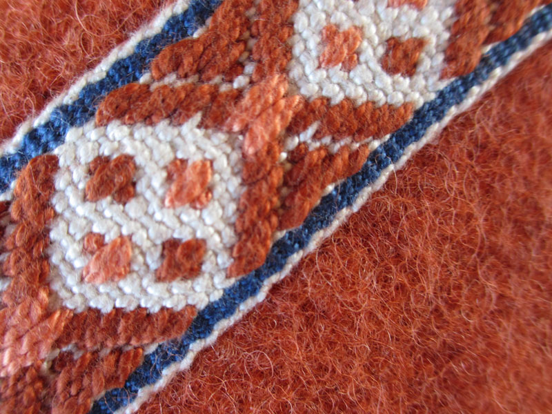 - Warp yarn: Perle cotton in size 5/2 in four colors, background (UKI natural), main pattern (Valley burnt sienna), accent pattern (UKI melon) and border (UKI cobalt blue).