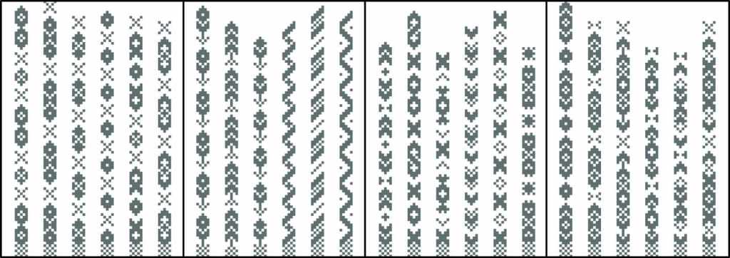The charts in my book, Pick-Up Bandweaving Designs (due out in August, 2024) are all for 13 pattern ends in Baltic-style pick-up. But if you’re a newly-minted pick-up weaver, weaving bands with fewer pattern ends is a great way to practice. And narrow ribbons are fun to weave—no matter your level of expertise. Below, you’ll find 24 charts for five pattern ends in four PDFs. In the next post, I’ll show three examples of how these patterns might be used in a band.