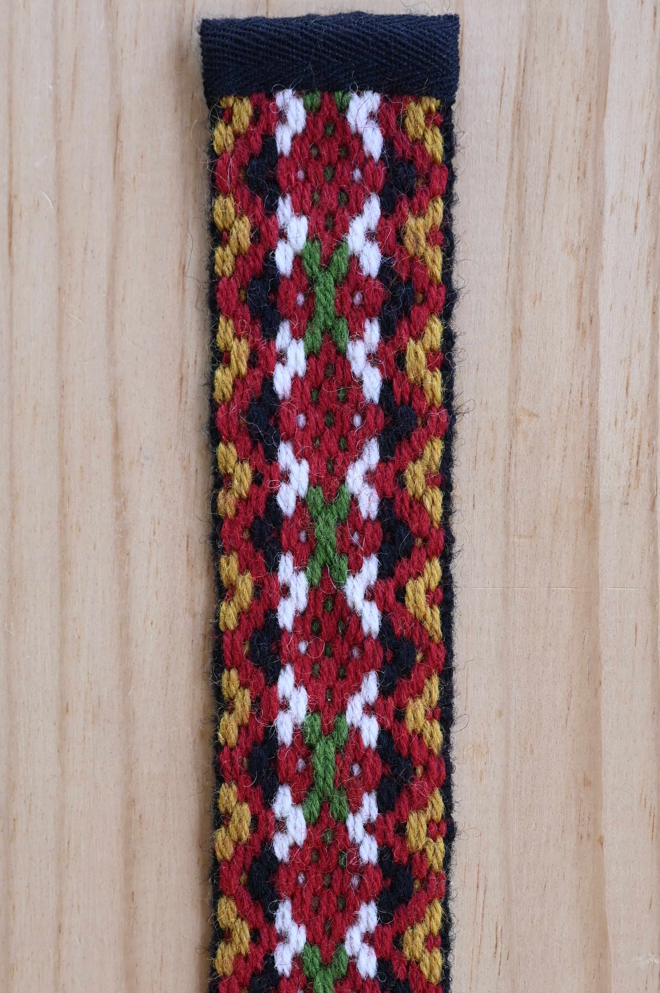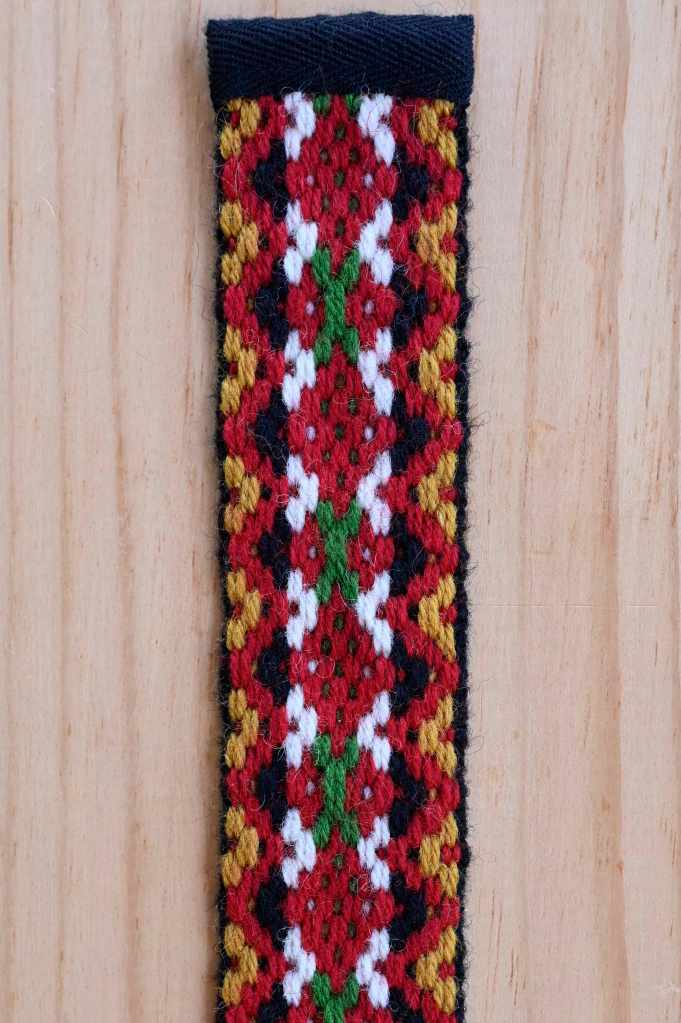 In preparing to present a webinar for Vesterheim on Norwegian bandweaving, September 21, 2025, I was intrigued with the pattern in a pair of suspenders from the Nordfjord region of Norway that I’d chosen to illustrate my talk. So I charted the pattern from the photograph and wove the above sample to the same width as the original. You can see the original at https://digitaltmuseum.no/011025121570/buksesele. They are believed to have been bridegroom’s suspenders.